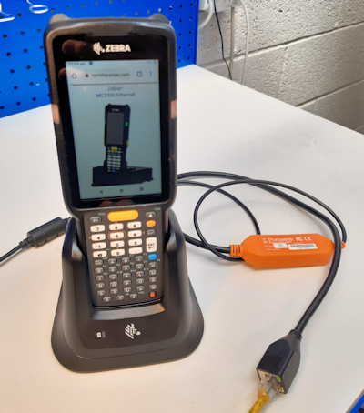 The PSA1uB1E-E which has a micro USB B connector can be used to connect a Zebra® (CRD-MC33-2SUCHG-01) USB cradle to ethernet.